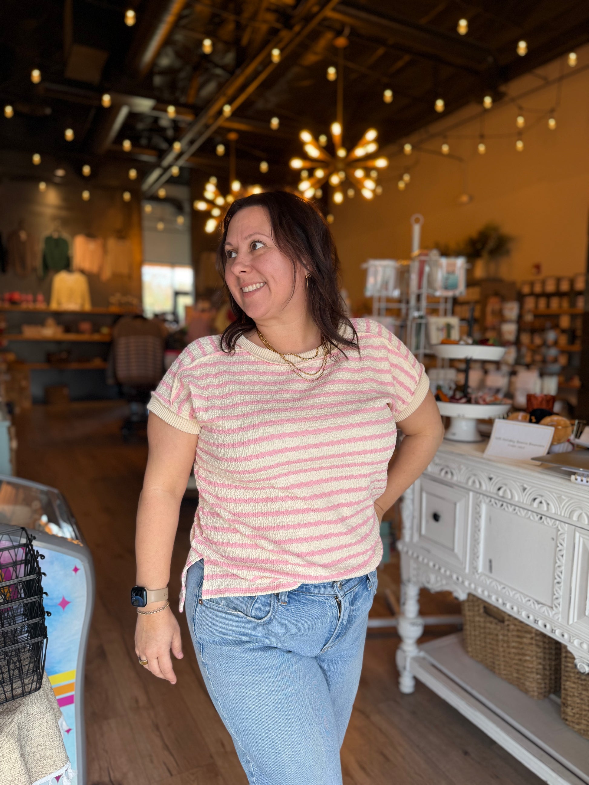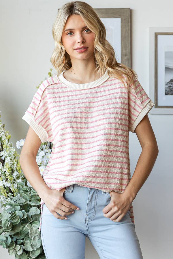 A STRIPE TEXTURED TOP FEATURING A ROUND NECK, SHORT SLEEVES, SIDE SLIT, AND A RELAXED FIT.